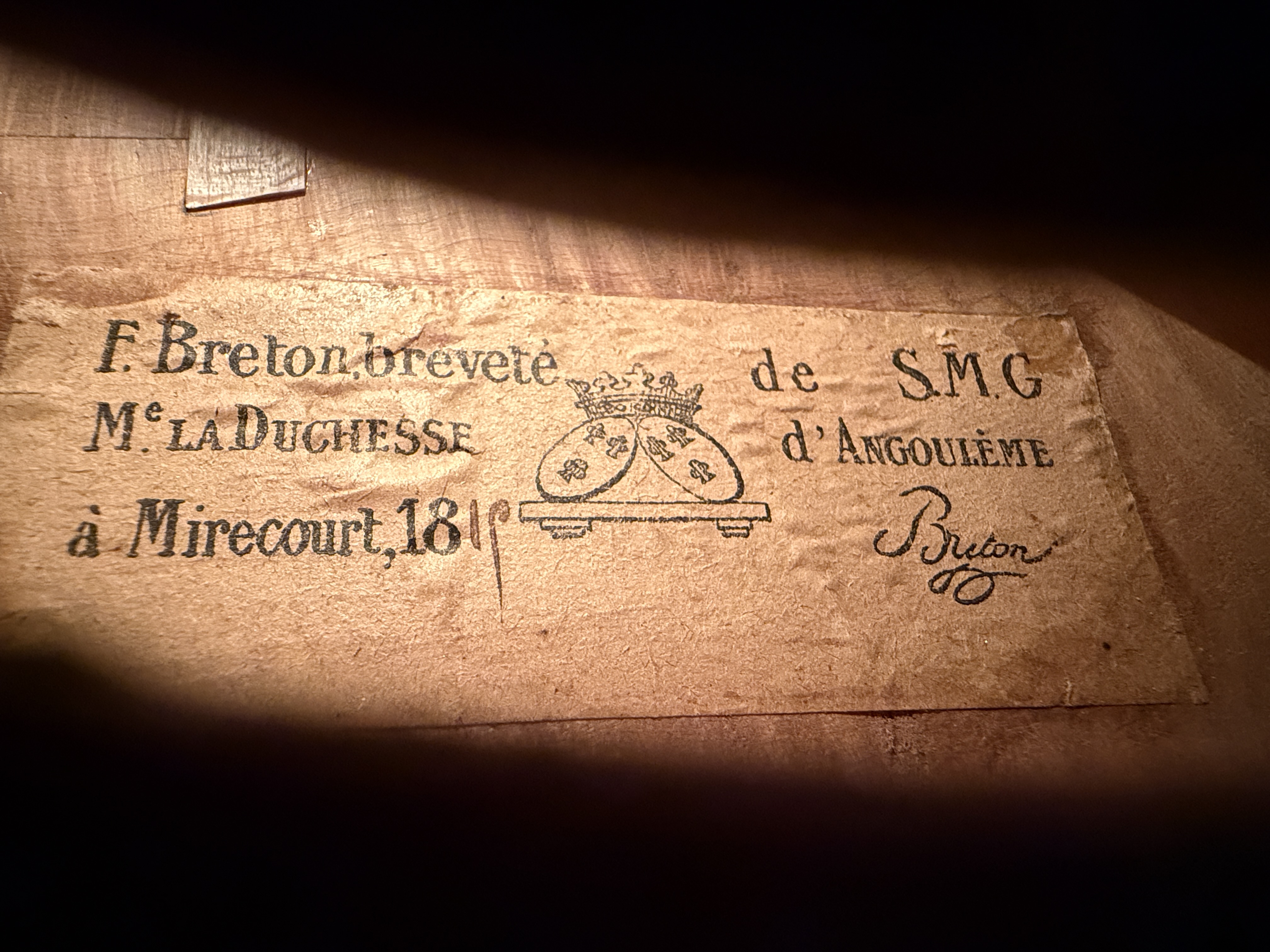 Die Violine wurde gebaut in Mirecourt 1830 von Francois Breton.