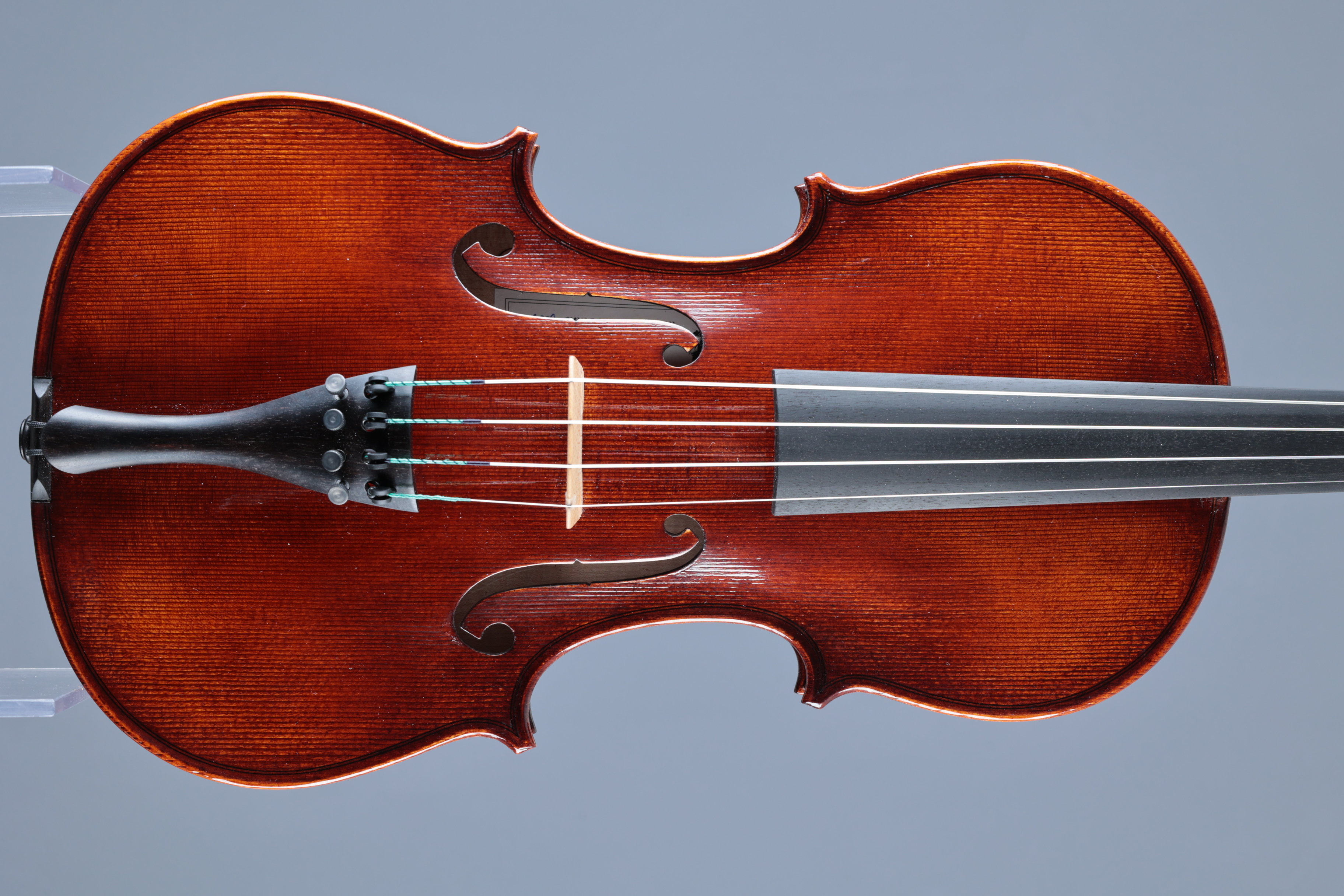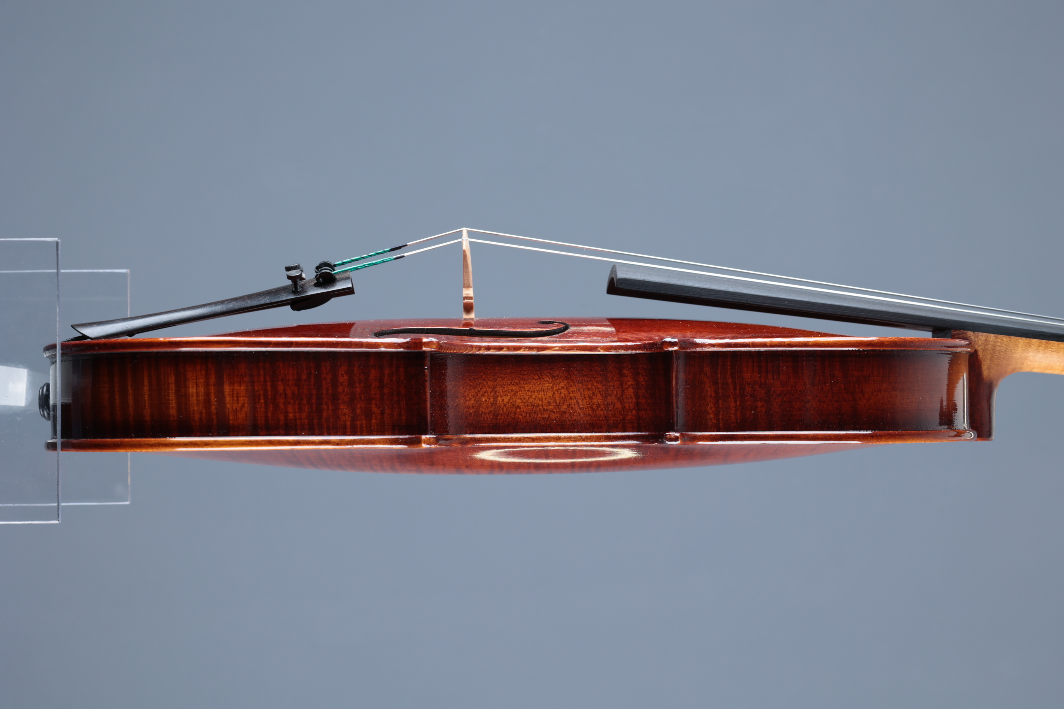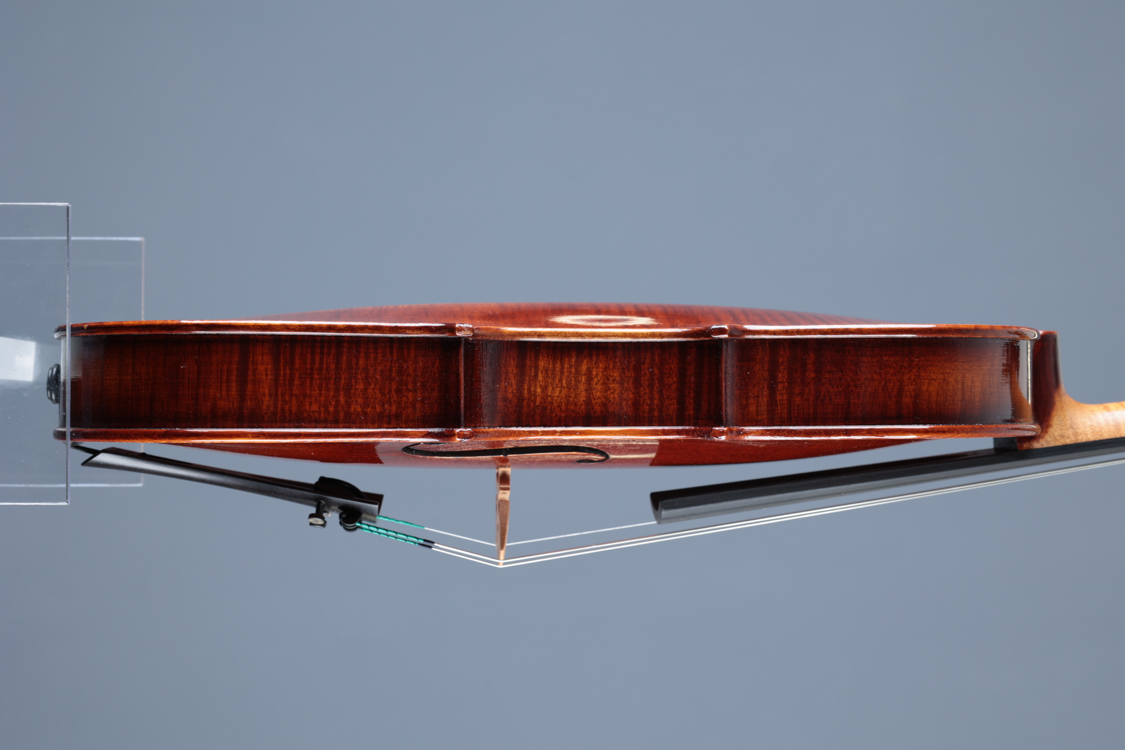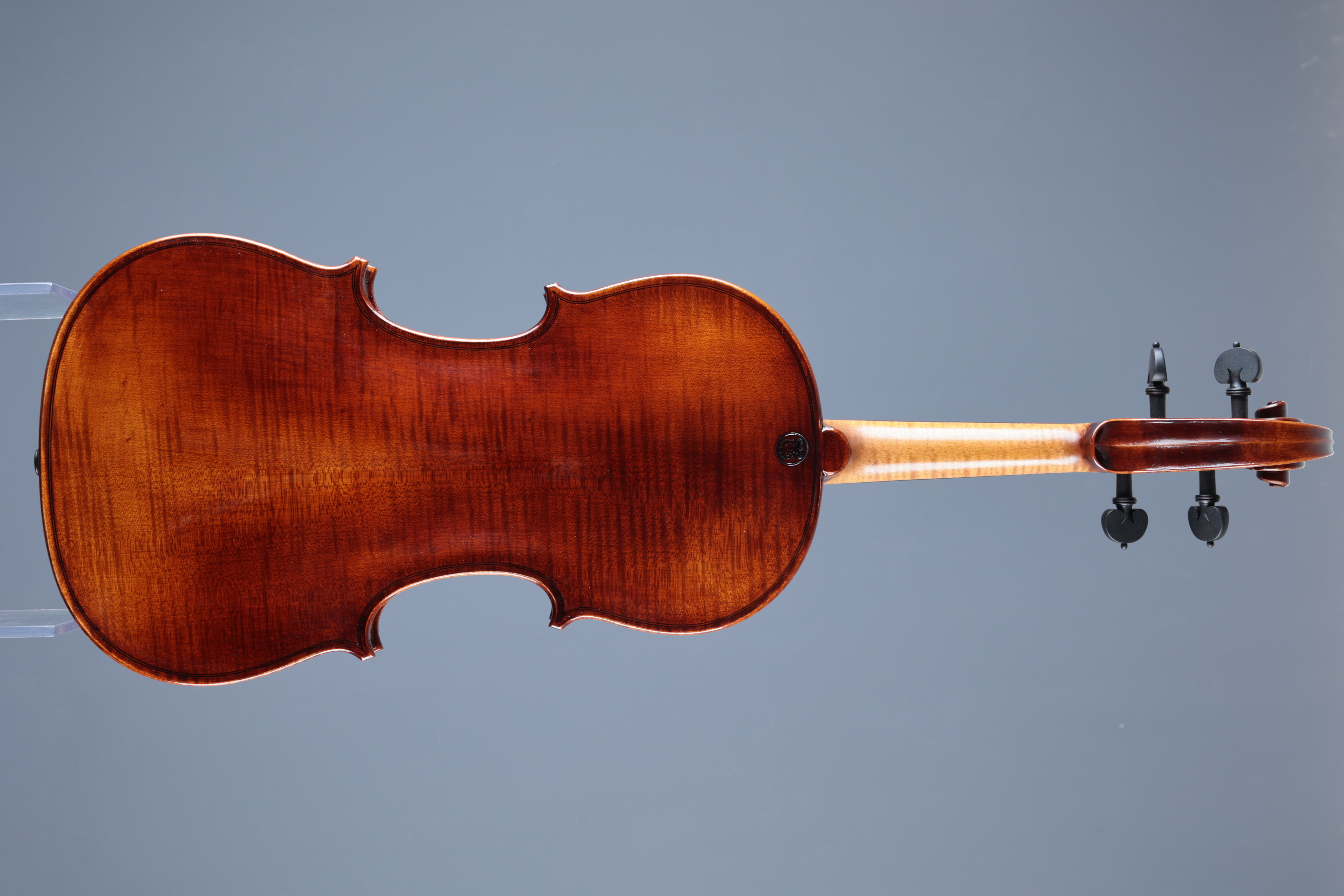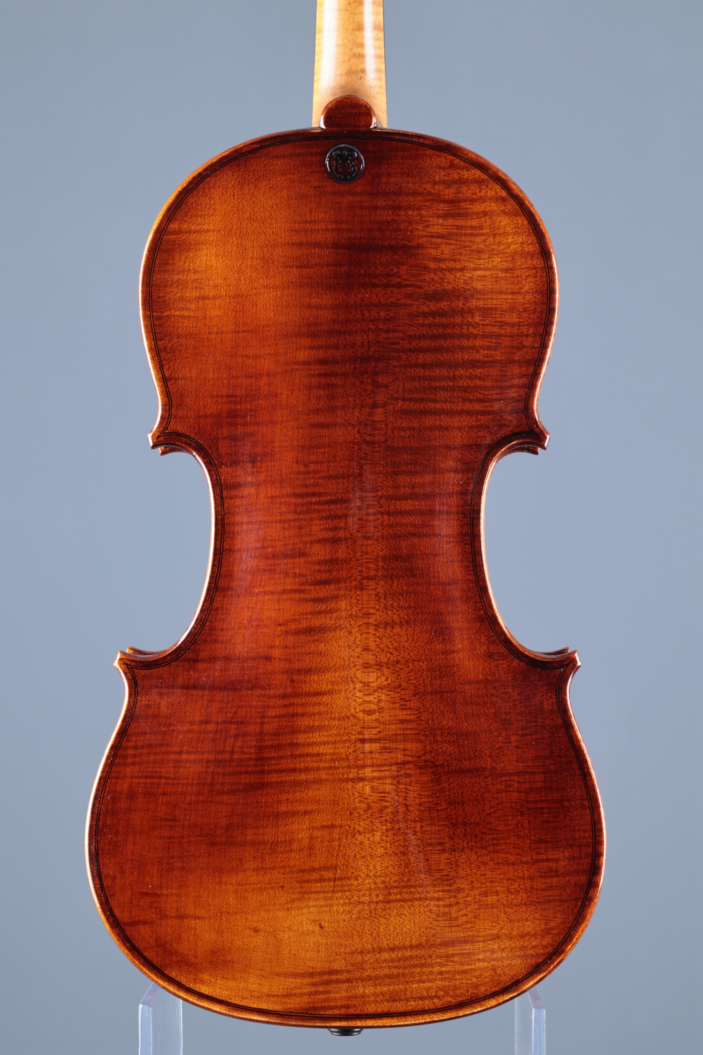 Sehr schöne Meistervioline "autumn Glow" von Rainer W. Leonhardt in Mittenwald, gebaut 2025.1-teiliger Boden aus seicht & eng geflammtem bosnischen Ahorn; Decke 2-tlg. aus Fichte mit feineren Jahresringen.