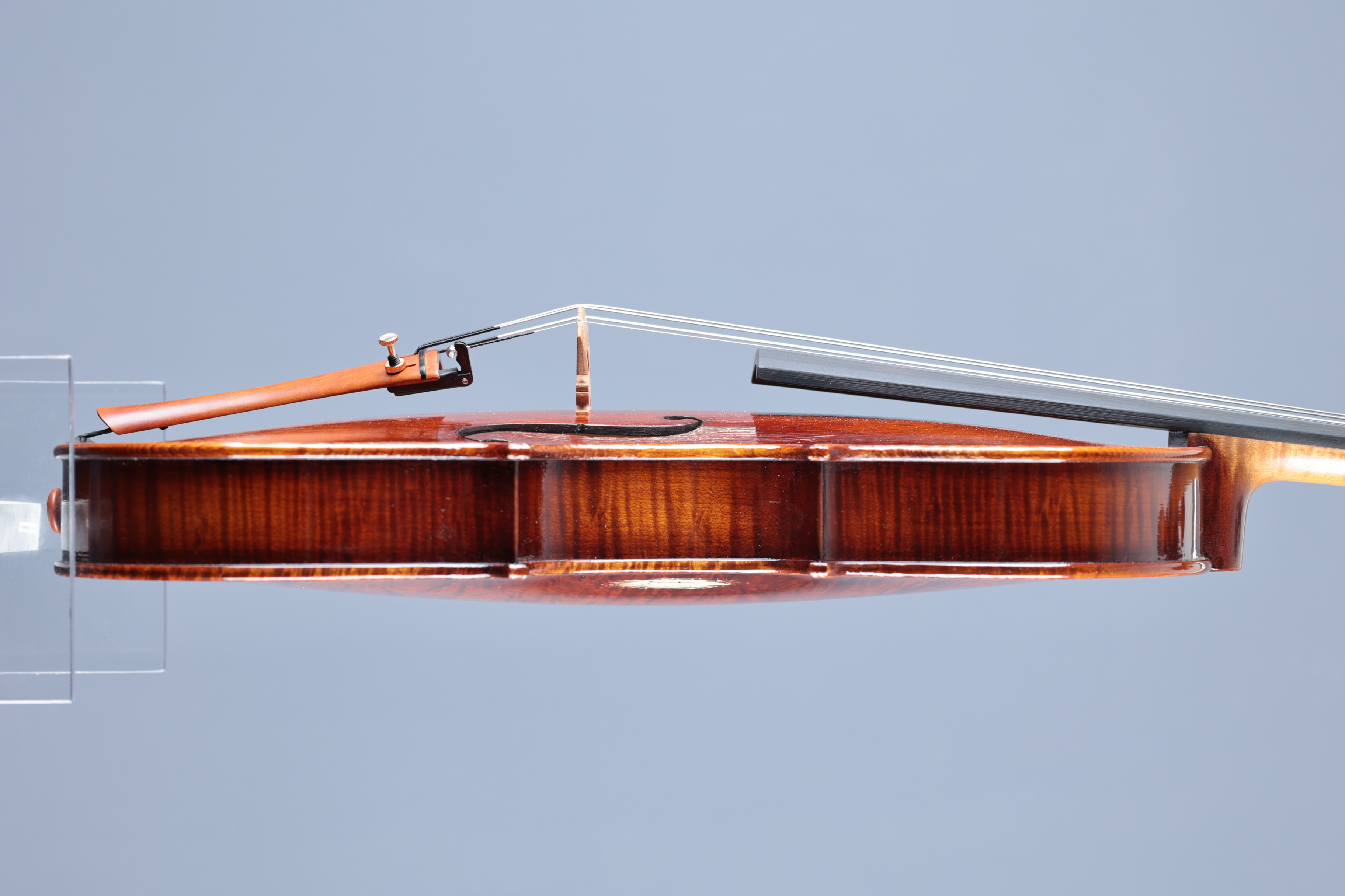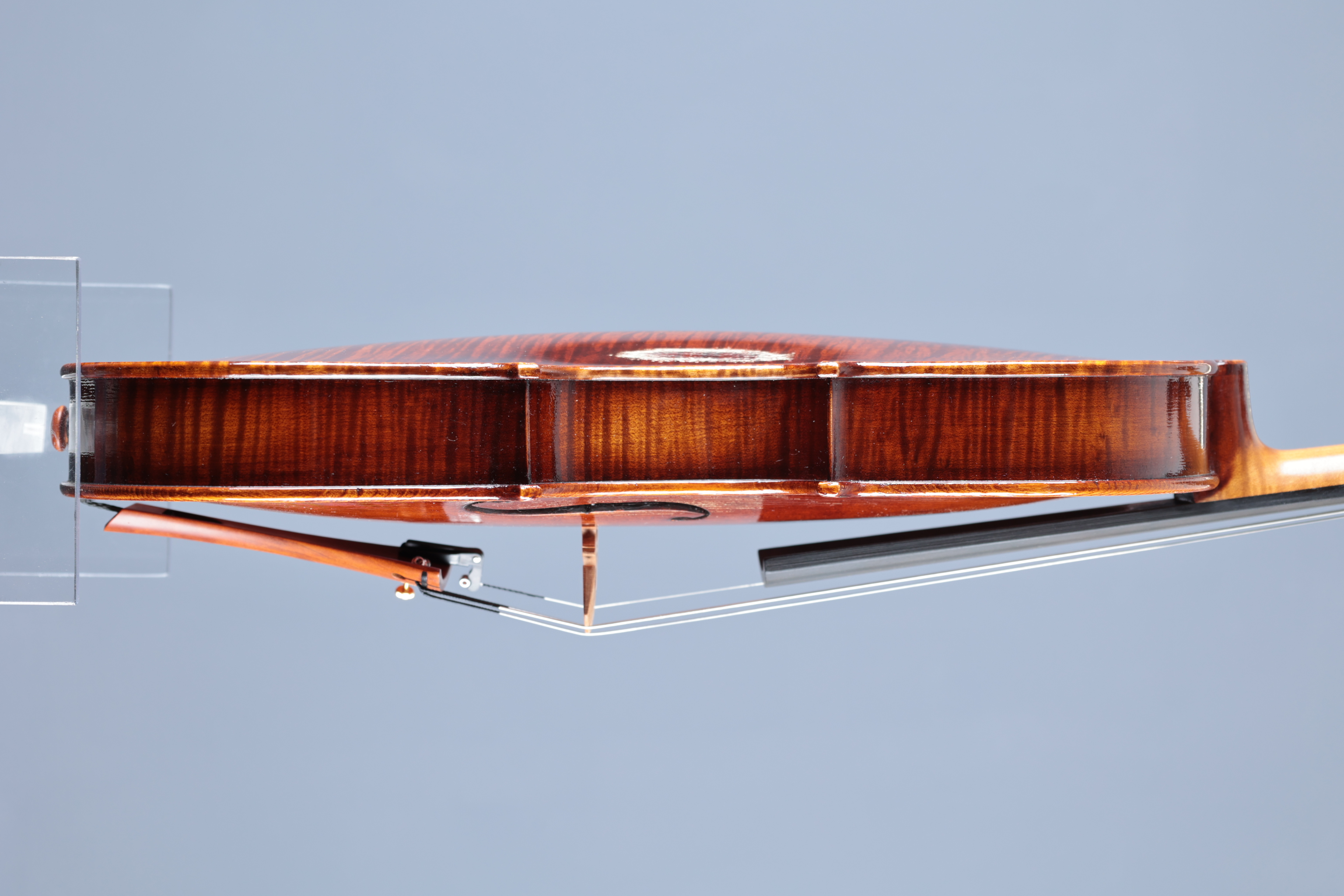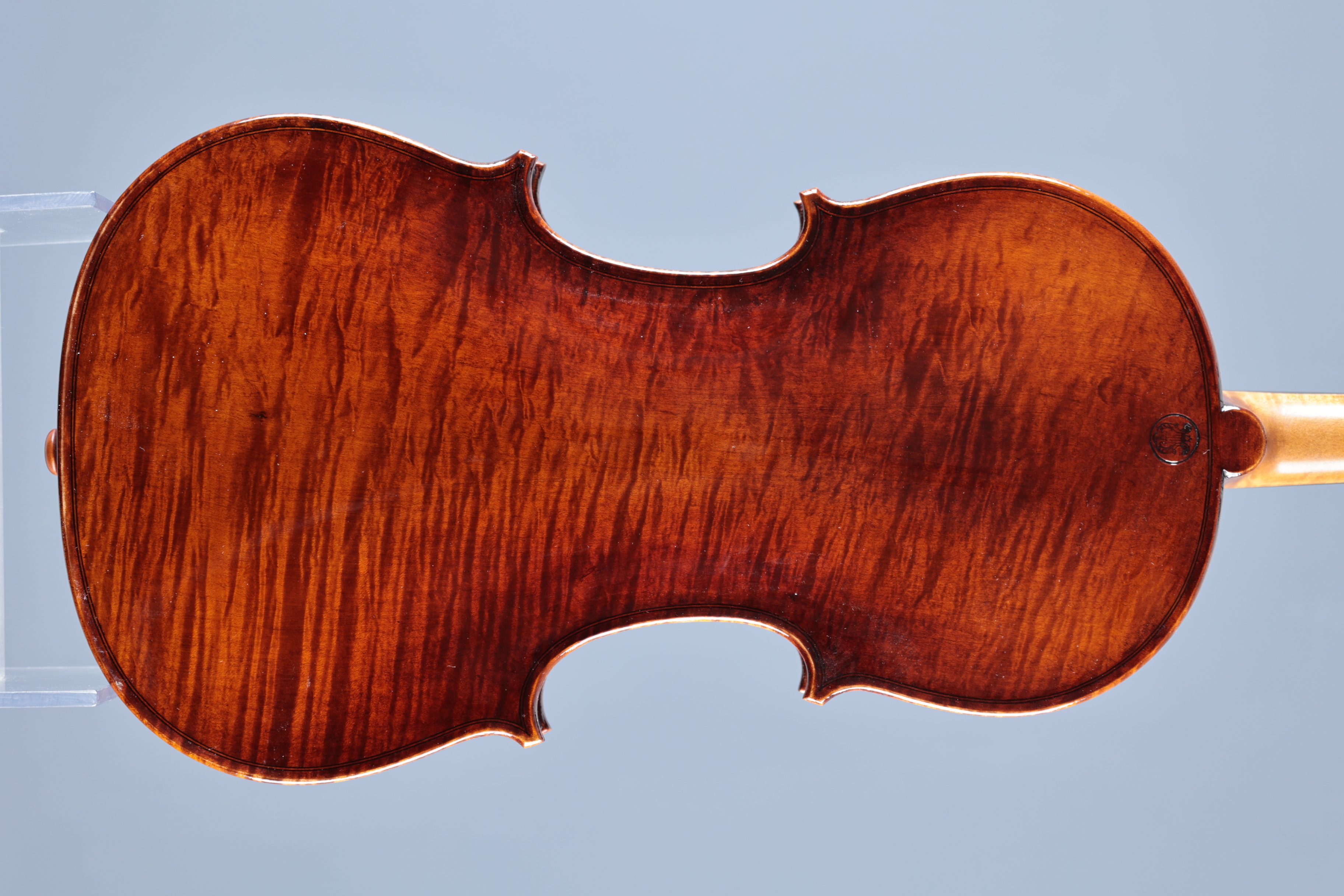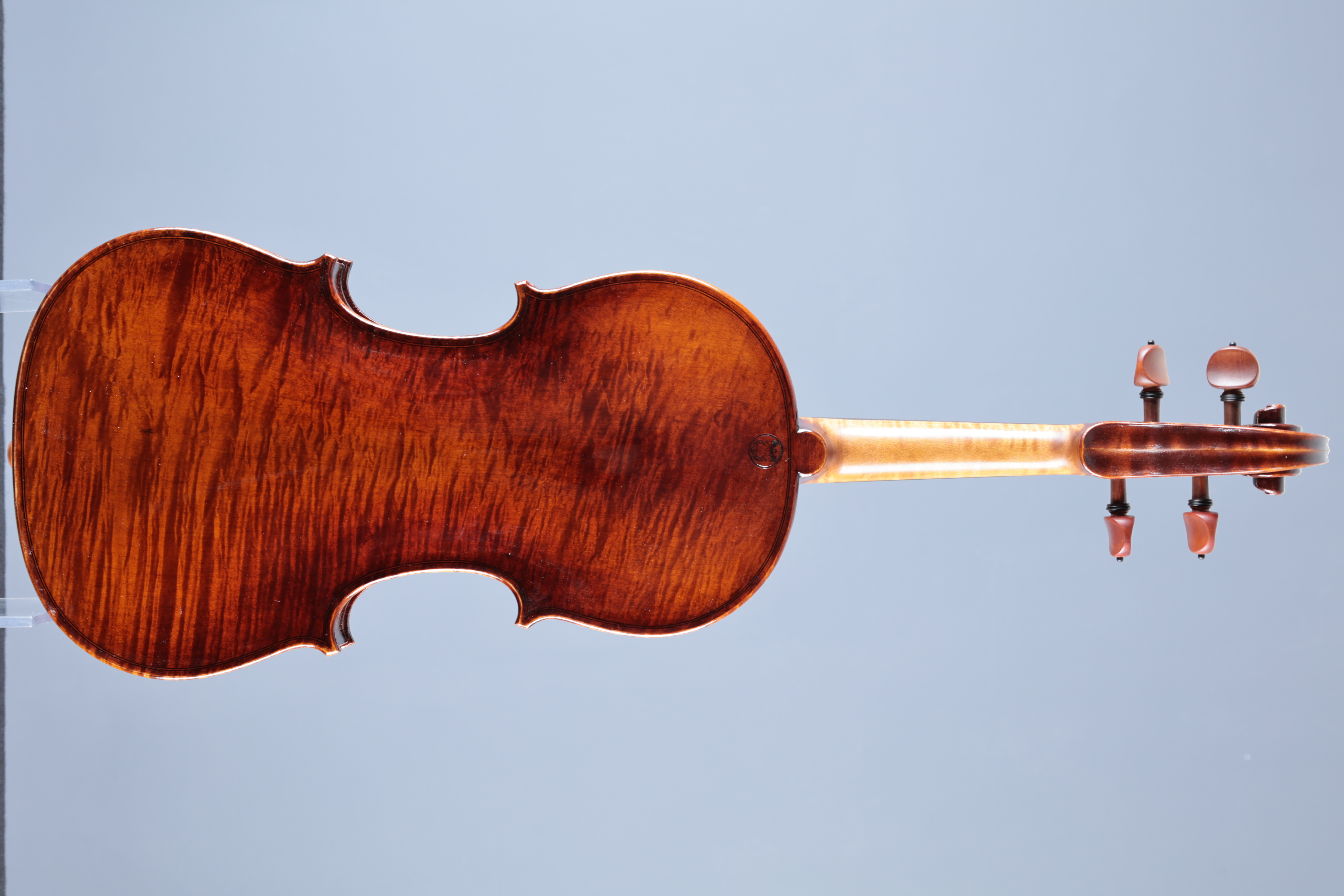 Sehr schöne Meistervioline "dunkler Herbst" aus unserer Werkstatt in Mittenwald, gebaut 2025.1-teiliger Boden aus wild geflammtem bosnischen Ahorn; Decke 2-tlg. aus Haselfichte mit mittelbreiten Jahresringen.