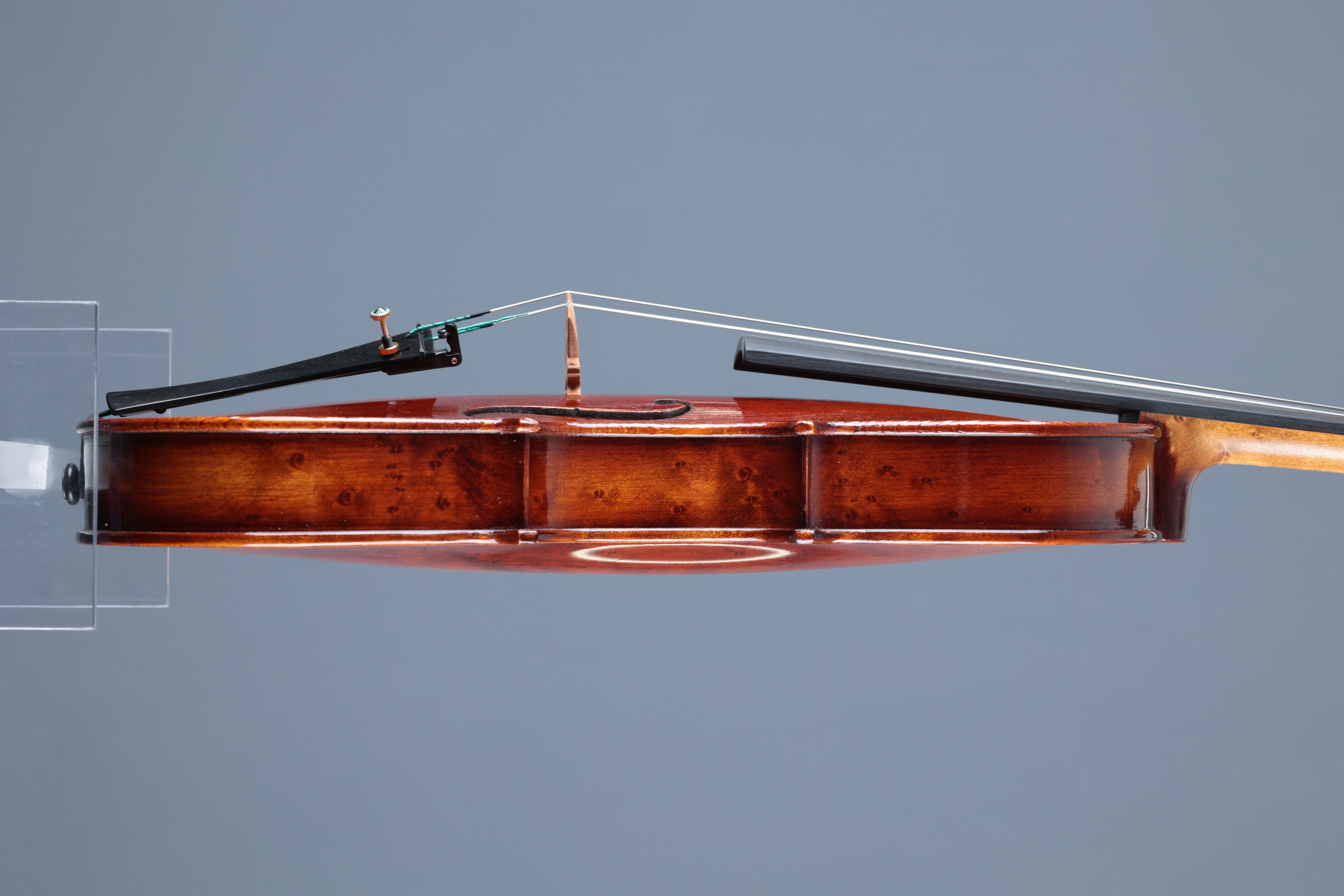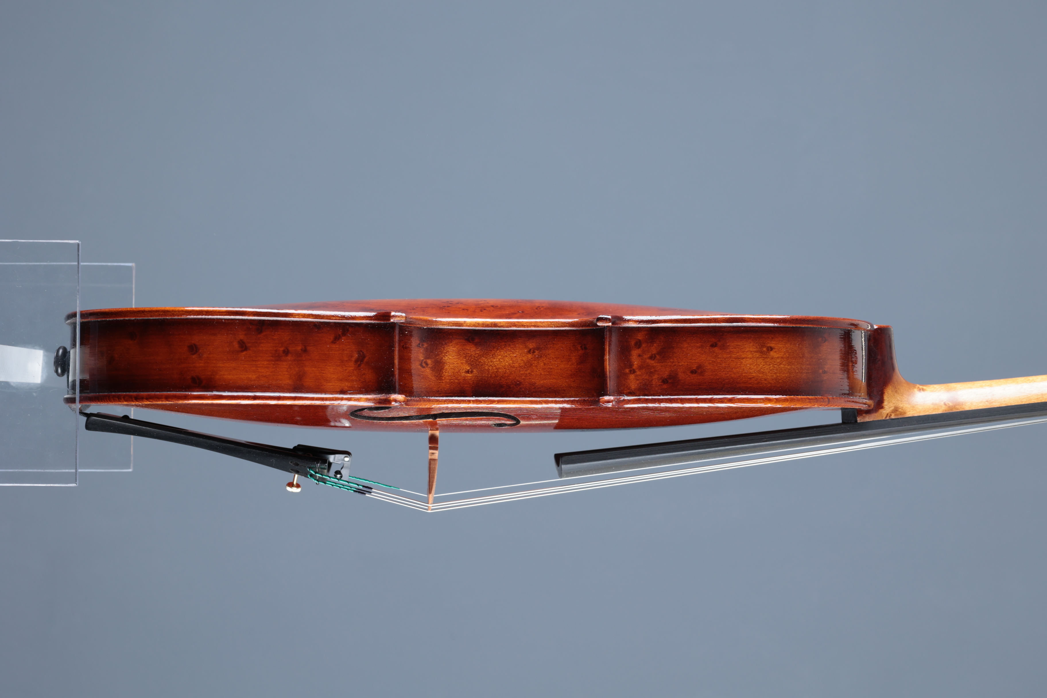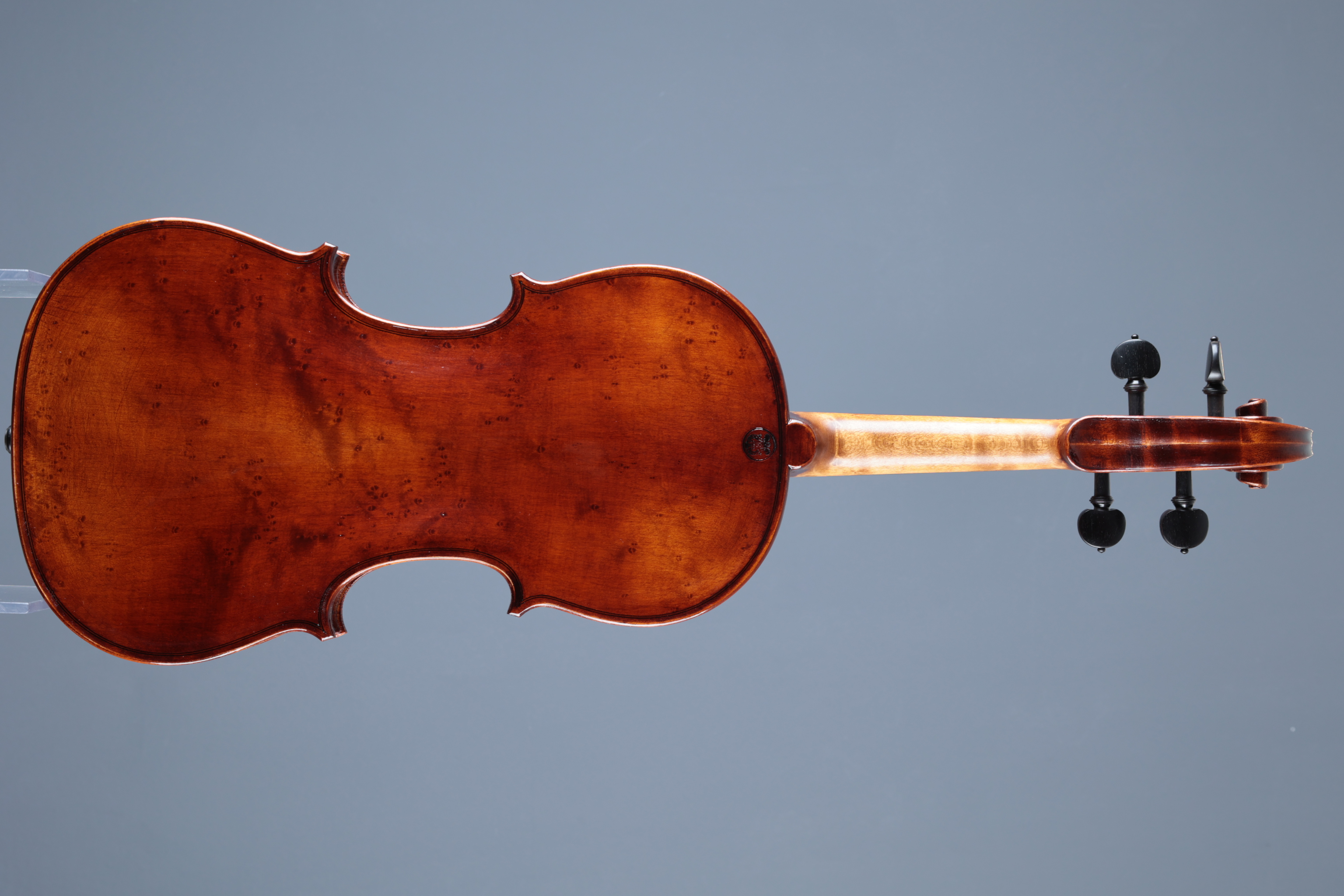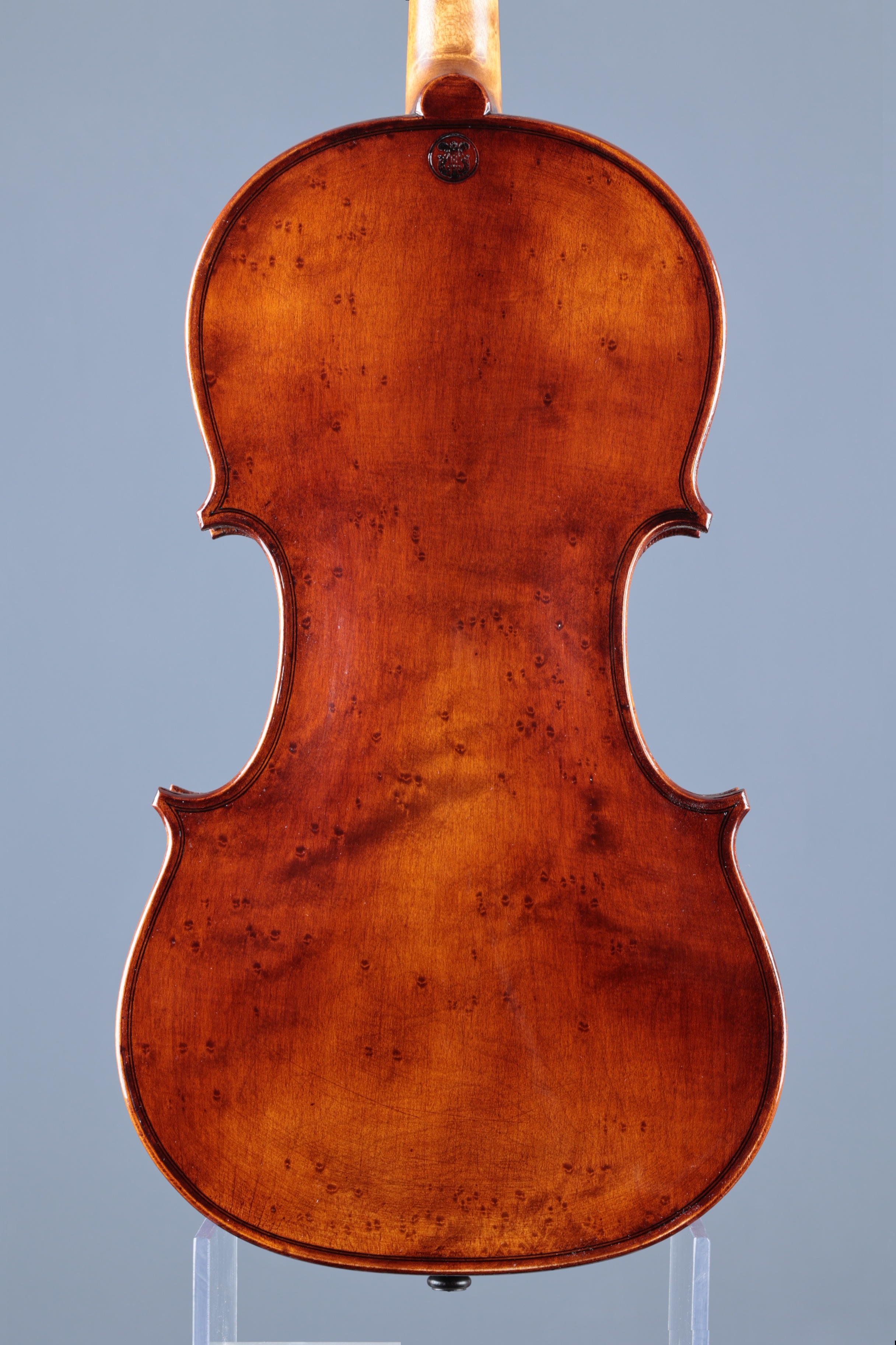 Schöne Meistervioline "November Bird" von Rainer W. Leonhardt in Mittenwald, gebaut 2025.1-teiliger Boden aus wunderschönem Vogelaugenahorn; Decke 2-tlg. aus Fichte mit mittelbreiten Jahresringen.